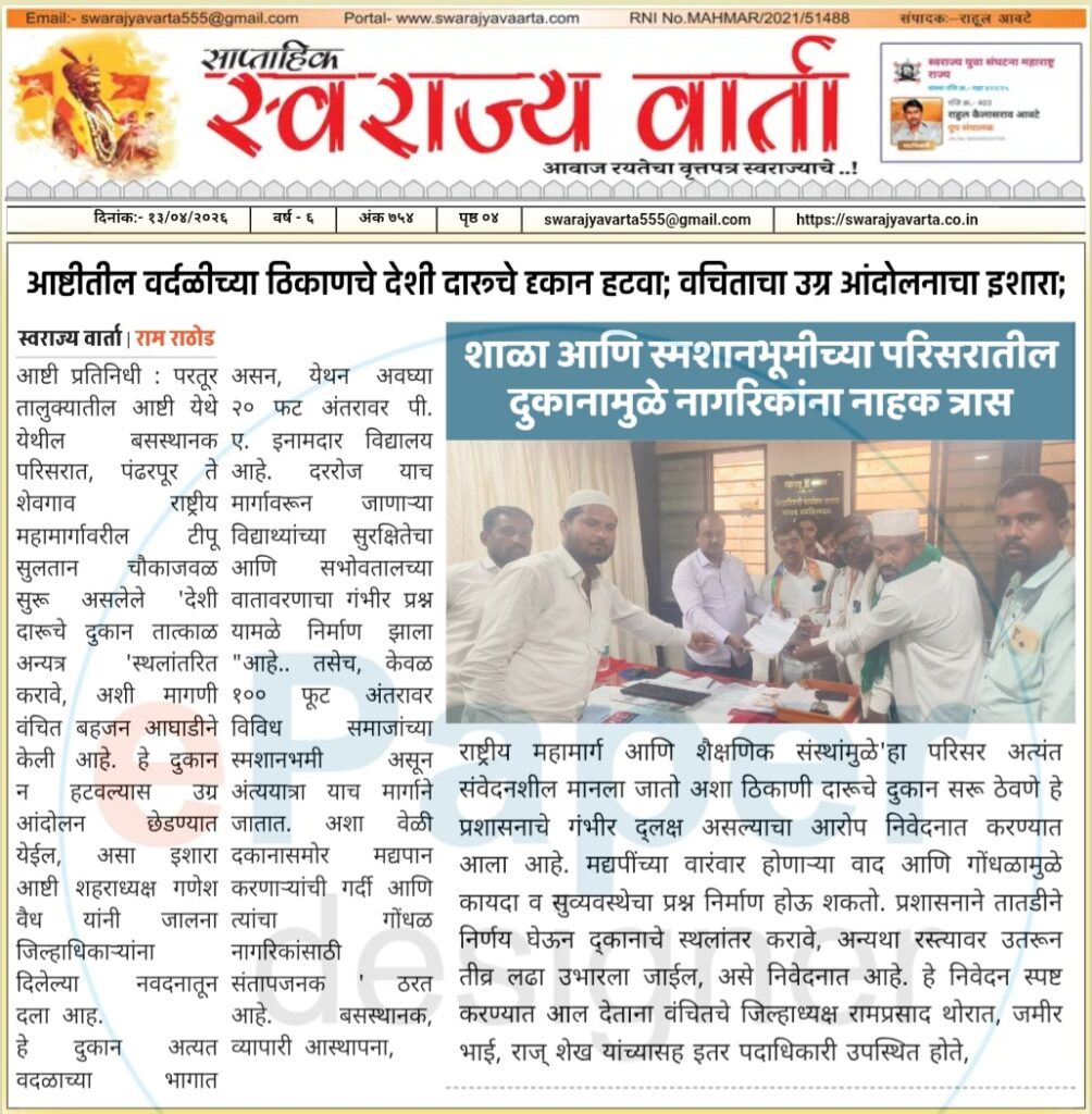 हे दुकान अत्यत वदळाच्या भागात असन, येथन अवघ्या २० फट अंतरावर पी. ए. इनामदार विद्यालय आहे. दररोज याच मार्गावरून जाणाऱ्या विद्याथ्यांच्या सुरक्षितेचा आणि सभोवतालच्या वातावरणाचा गंभीर प्रश्न यामळे निर्माण झाला “आहे.. तसेच, केवळ १०० फूट अंतरावर विविध समाजांच्या स्मशानभमी असून अंत्ययात्रा याच मार्गाने जातात. अशा वेळी दकानासमोर मद्यपान करणाऱ्यांची गर्दी आणि त्यांचा गोंधळ नागरिकांसाठी संतापजनक ‘ ठरत आहे. बसस्थानक, व्यापारी आस्थापना, राष्ट्रीय महामार्ग आणि शैक्षणिक संस्थांमुळे’हा परिसर अत्यंत संवेदनशील मानला जातो अशा ठिकाणी दारूचे दुकान सरू ठेवणे हे प्रशासनाचे गंभीर द्लक्ष असल्याचा आरोप निवेदनात करण्यात आला आहे. मद्यपींच्या वारंवार होणाऱ्या वाद आणि गोंधळामुळे कायदा व सुव्यवस्थेचा प्रश्न निर्माण होऊ शकतो. प्रशासनाने तातडीने निर्णय घेऊन द्कानाचे स्थलांतर करावे, अन्यथा रस्त्यावर उतरून तीव्र लढा उभारला जाईल, असे निवेदनात आहे. हे निवेदन स्पष्ट करण्यात आल देताना वंचितचे जिल्हाध्यक्ष रामप्रसाद थोरात, जमीर भाई, राज् शेख यांच्यासह इतर पदाधिकारी उपस्थित होते.